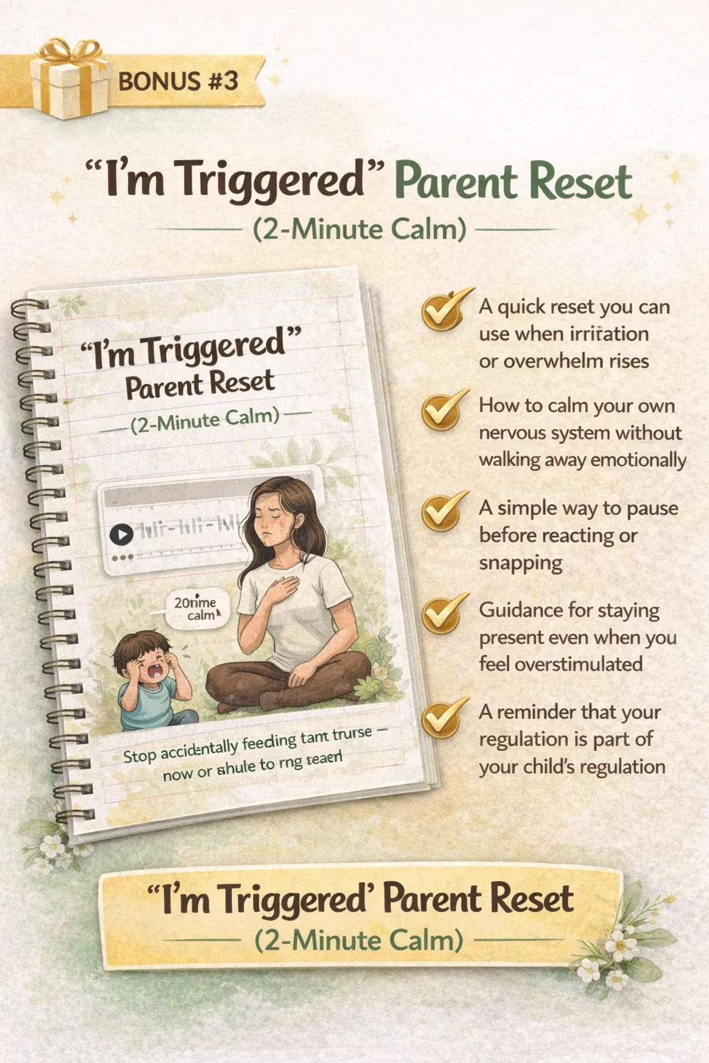 Learn the subtle but common mistakes parents make during tantrums — and why they accidentally keep meltdowns going. This bonus shows you what actually helps instead, so you can stop second-guessing yourself and feel confident you’re not making things worse.